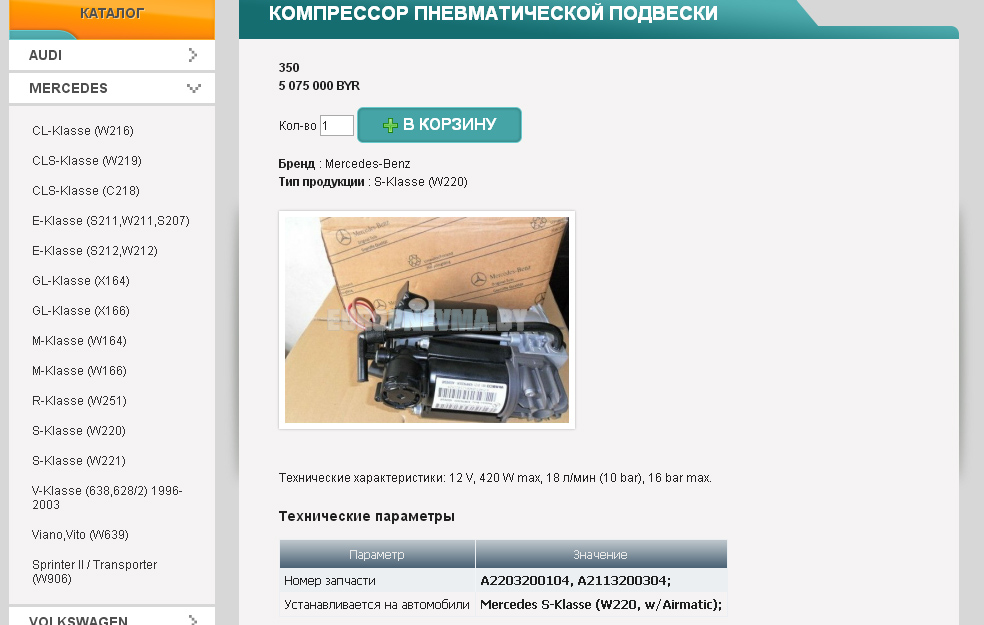 А вот эти же китайские компрессоры на сайте белорусского магазина europnevma.by, здесь они проходят как Бренд : Mercedes-Benz. Только подделать оригинальную упаковку им не удалось.